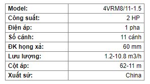 Máy bơm hỏa tiễn 4inch cánh nhựa VERATTI 4VRM8/11-1.5 thuộc dòng máy bơm chìm giếng khoan là loại :